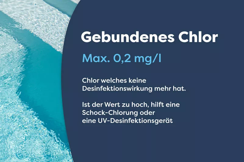 Um Gesundheitsbeschwerden vorzubeugen, sollte nicht mehr als 0,5 mg/l gebundenes Chlor im Becken sein. Bei öffentlichen Pools sollte nicht mehr als 0,2 mg/l gebundenes Chlor im Wasser sein.