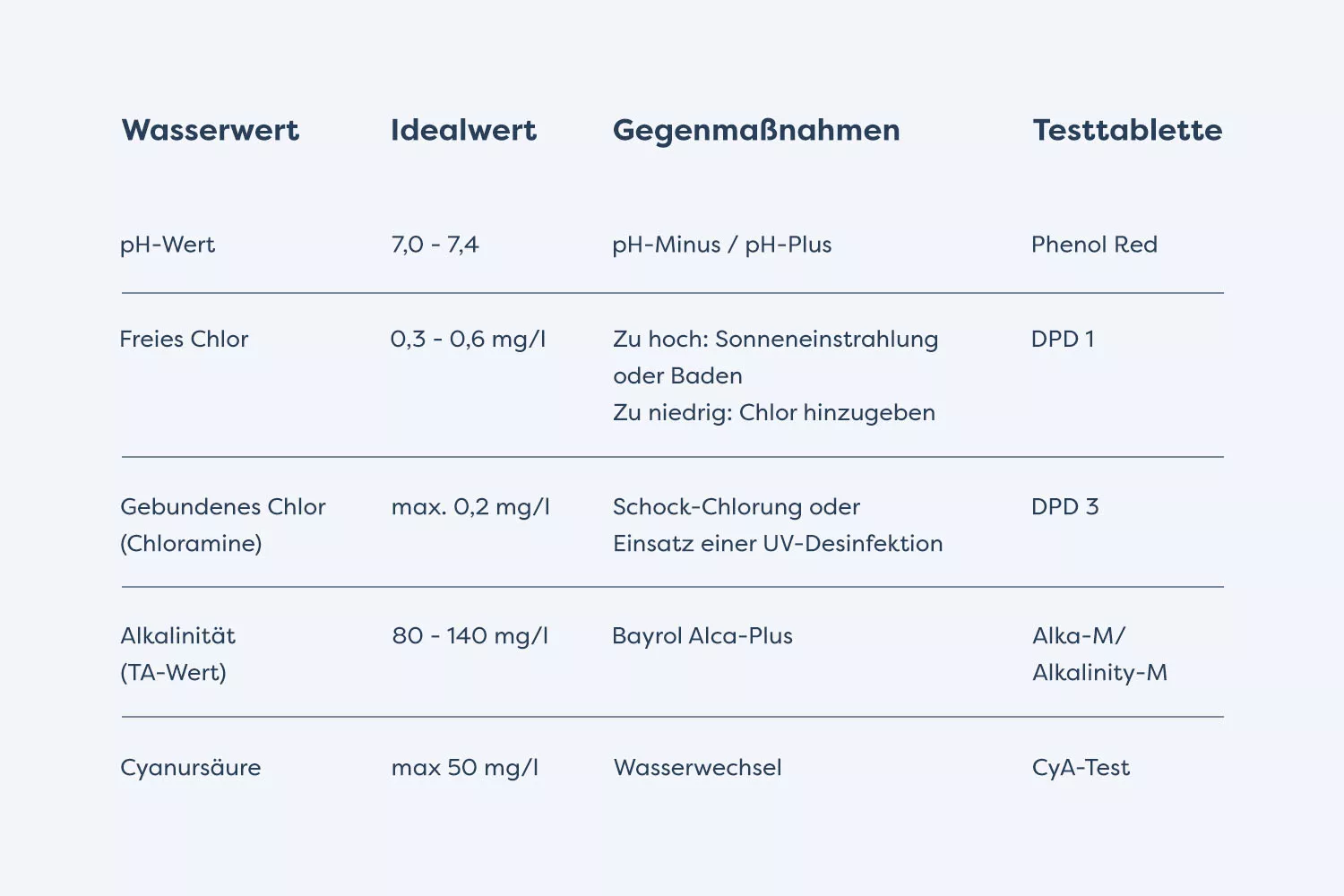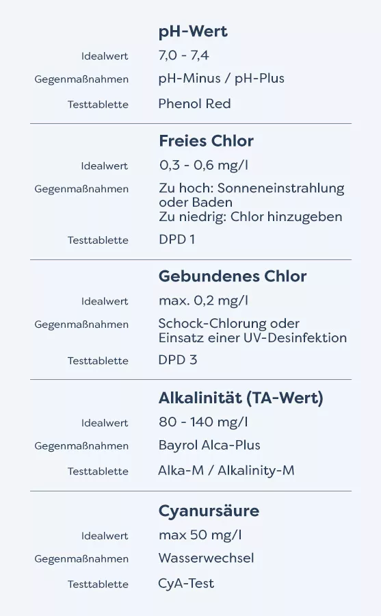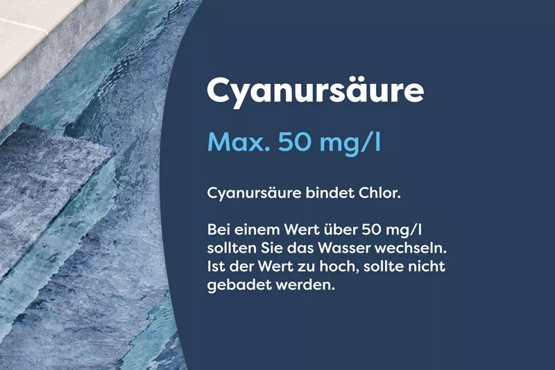 - Der CYA oder Cyanursäurewert: Max. 50 mg/l